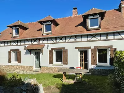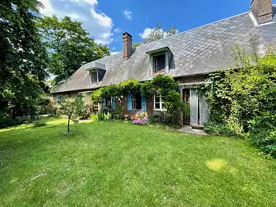Dans un parc d'un hectare, propriété normande constituée de deux chaumières et leurs annexes. L'habitation principale consiste en deux chaumières relièes entre elles par un hall...