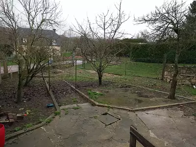 Maison semi individuelle Entrée cuisine avec accès garage et terrain Pièce de vie salon salle à manger À l'étage Palier Salle de bains Rangement Trois chambres Terrain Garage Honoraires...