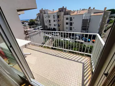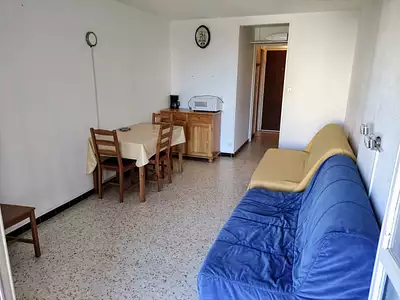 Le Cap d'Agde - Falaises : Appartement T2/cabine comprenant : entrée, wc, salle d'eau, 1 chambre cabine avec fenêtre, séjour, cuisine aménagée, 1 chambre avec placard, loggia vitrée....