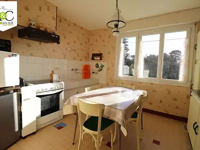 QUIMPERLE. CETTE MAISON VOUS OFFRE UN BEL ET VASTE ESPACE A VIVRE AVEC SA CUISINE EQUIPEE OUVERTE SUR SA SALLE A MANGER, SALON/SEJOUR AVEC POELE A GRANULES ET GRAND BUREAU AVEC ACCES A LA...