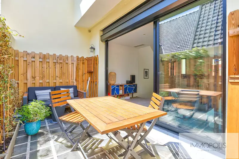 Villa Étienne Marey, Paris XXe. En exclusivité, Immopolis vous présente une maison pleine de charme, entièrement rénovée, nichée dans un environnement exceptionnel : la Villa Étienne Marey, une impasse pavée au calme absolu, en plein coeur du 20e arrondissement de Paris. D'une superficie d'environ 100 m² répartis sur trois niveaux, ce bien rare offre des prestations de qualité et une distribution optimale des espaces. Rez-de-chaussée : Une première chambre de 11m², une salle de bains de 4,48 m², des toilettes séparées, une seconde chambre de 11 m² (ventilée sans ouvrant et bénéficiant d'une belle lumière zénithale), ainsi qu'une buanderie et un cellier. Premier étage : Une vaste pièce de vie de 30 m², baignée de lumière, ouvrant sur une agréable terrasse de 10,8 m² exposée sud-est et sans vis-à-vis. Une cuisine ouverte entièrement équipée complète ce niveau. Dernier étage : Une suite parentale d'environ 23 m² avec salle d'eau, WC, dressing et coin bureau. Cette chambre donne également accès à une seconde terrasse de 8 m², offrant une vue dégagée sur les toits de Paris. La maison bénéficie d'une excellente isolation thermique, de dressings sur mesure, de la climatisation réversible et d'un système d'alarme. Située à proximité immédiate du métro lignes 3 et 7bis, entre la place Édith Piaf et Pelleport, Dans le prolongement de la Campagne à Paris, cette maison offre un cadre de vie unique, à la fois paisible et proche de toutes les commodités. Un bien rare sur le marché parisien, à découvrir sans tarder.