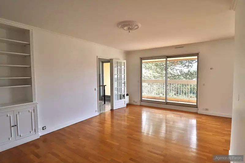 VERRIÈRES-LE-BUISSON - A proximité des commerces et 4' à pied des écoles, dans une résidence de standing avec ascenseur, appartement de 5 pièces principales comprenant : Entrée avec placard, séjour double parqueté donnant sur une large loggia, cuisine équipée, dégagement avec placards, chambre parentale avec dressing aménagé et salle de bains privative, deux chambres parquetées, salle de douche, WC avec lave mains. Une place de parking privative et une cave en sous-sol. (4.00 % honoraires TTC à la charge de l'acquéreur.) Copropriété de 618 lots - dont 222 lots habitation. (Pas de procédure en cours). Charges annuelles : 4732.2 euros.