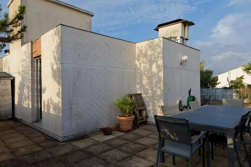 Idéalement situé à 7 mn du centre-ville et 8 mn de la gare (RER A et ligne J), il se compose d'une grande entrée avec placard, une 1ère chambre et une cuisine récemment aménagée donnant sur la terrasse. Un couloir (avec un cellier) conduit à un grand salon/salle à manger lumineux donnant aussi sur la terrasse, à un coin "nuit" avec 2 chambres, une salle de bain, une salle de douche ainsi que deux WC. Un très grand dressing tapisse le couloir.