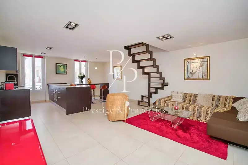 Idéalement situé dans une rue piétonne, à 100m² des plages et de la Croisette, ce charmant appartement duplex de plus de 100m² en dernier étage et exposé plein sud.