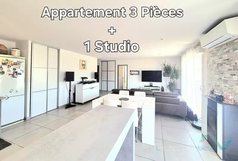 L'appartement T3, très lumineux grâce à son exposition Sud, est d'une superficie d'environ 83 m2 . Il comprend une grande entrée avec rangements, une agréable pièce à vivre climatisée d'environ 41m2 avec une belle cuisine ouverte et équipée, un poele à granulés, un cellier, de nombreux espaces de rangements. Côté nuit il se compose de 2 chambres de 12,37 m2 et 10,55 m2 avec rangements et 1 salle d'eau avec douche à l'italienne et WC.