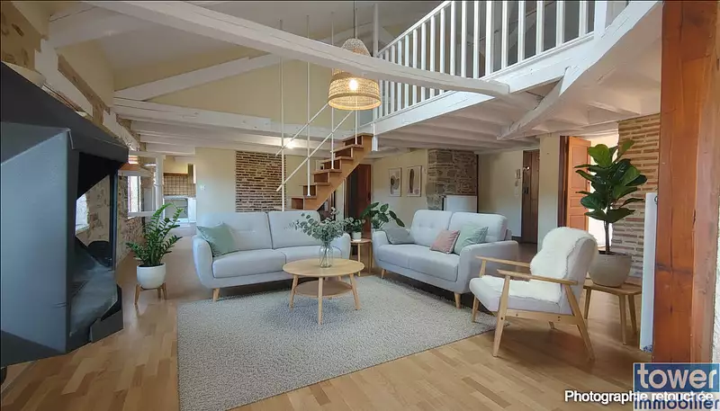 Il se compose d’un grand salon lumineux avec cheminée, d’une cuisine équipée séparée, de trois chambres (21, 12 et 10 m2), et d’une salle de bain. Un bureau peut être aménagé en mezzanine