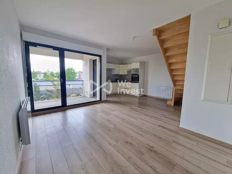 A vendre : Sur le secteur III Maisons - Vayringe, dans une copropriété de 2011 en très bon état, appartement duplex au 2ème et dernier étages avec ascenseur, il se compose au RDC : d'une entrée avec placard de rangement, une pièce de vie avec cuisine aménagée et équipée ouverte sur séjour avec accès terrasse orientée Sud Ouest, 2 belles chambres, un w.c séparé et une salle de bain a vec baignoire, à l'étage, on retrouve 2 grande chambres et une buanderie - cellier. l'appartement bénéficie d'une place de parking souterraine avec accès via l'ascenseur et porte motorisé. Charges : 145€/mois comprenant : (entretien ascenseur et portail véhicule, communs, syndic, eau froide)