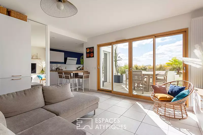 A Sathonay, au dernier étage d'un immeuble contemporain, ce duplex de 102 m² se déploie comme un véritable cocon. Ici, tout semble pensé pour inviter la lumière et le calme. La terrasse plein ciel de 62 m², sans vis-à-vis, domine le paysage et offre une vue dégagée sur les Monts d'Or , un panorama vivant, changeant au fil des saisons. Dès l'entrée, le ton est donné : les aménagements sur mesure et la qualité des finitions créent une atmosphère sobre et élégante. Le séjour, baigné de soleil, ouvre sur une cuisine contemporaine entièrement intégrée, dans un esprit convivial et épuré. Les grandes baies vitrées prolongent naturellement l'espace vers l'extérieur où la terrasse devient une pièce à part entière avec sa vue panoramique son store banne, ses brise-soleil orientables et son arrosage automatique. Un lieu pensé pour vivre dehors, du petit-déjeuner au coucher du soleil. Sur ce premier niveau, une suite parentale avec salle d'eau et accès direct à la terrasse compose un espace intime et fonctionnel. A l'étage, un dégagement aménagé en salle de jeux distribue trois chambres lumineuses, ainsi qu'une salle de bains et un toilette indépendant. Les volumes, le silence et la clarté participent à une sensation de bien-être immédiate. Le calme est total, et la proximité de la gare rend la vie quotidienne aussi fluide que plaisante. Au sous-sol, deux places en sus côte à côte, pré-équipées pour borne électrique et avec possibilité de les transformer en garages fermés, complètent ce bien rare. L'immeuble autorise l'installation de la climatisation pour un confort optimal en toute saison. Un duplex unique, entre ciel et collines, où l'architecture contemporaine s'efface pour laisser place à la lumière, à l'horizon, et à une qualité de vie d'exception. Bien soumis au statut de la copropriété : 41 lots Charges annuelles : 4656 euros (chauffage et eau inclus) CLASSE ENERGIE : B / CLASSE CLIMAT : A Montant moyen estimé des dépenses annuelles d'énergie pour un usage standard, établi à partir des prix de l'énergie de l'année 2023 : entre 690 euros et 990 euros Contact : Loic - 07 61 09 19 75 Copropriété de 41 lots (Pas de procédure en cours). Charges annuelles : 4656 euros. Loic Odouard (EI) Agent Commercial - Numéro RSAC : 753 650 721 - Lyon.