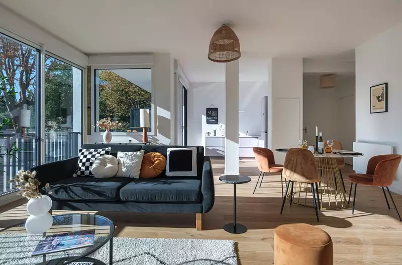 Dès l'entrée, vous serez séduit par un vaste séjour/cuisine de 47 m², baigné de lumière grâce à ses grandes baies vitrées offrant un accès direct à une superbe terrasse et un jardin privatif, sans aucun vis-à-vis – un véritable écrin de verdure en ville.