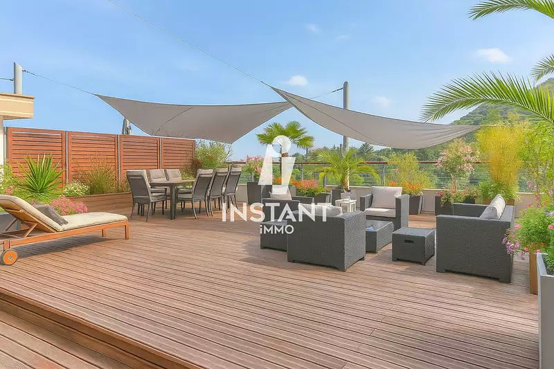 Dès l'entrée, le placard optimise parfaitement l'espace. Le séjour cuisine de 34 m², exposé plein Sud Est, bénéficie d'une luminosité continue et s'ouvre sur une terrasse ensoleillée de 50m² — un véritable prolongement de la pièce à vivre.