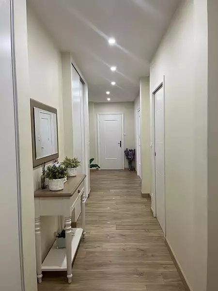 L’entrée s’ouvre sur un vaste hall desservant une cuisine entièrement équipée (four, micro-ondes, hotte, plaque de cuisson) et aménagée, ainsi qu’un salon agrémenté d’un parquet ancien de caractère. Une première chambre complète cet espace de vie.