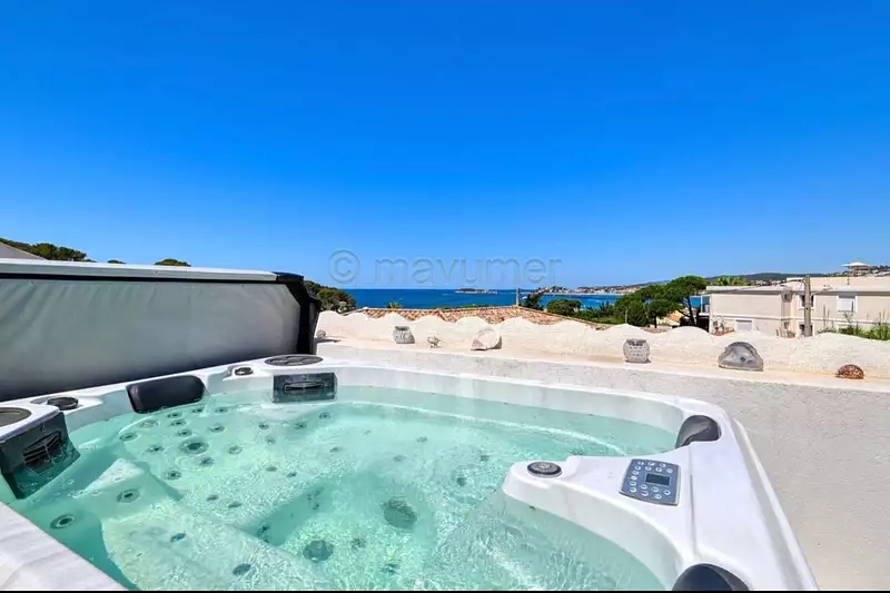 À l'étage, l'intimité domine. Deux chambres se font face, reliées par une grande salle de bain avec baignoire, douche et wc. Toutes deux s'ouvrent sur une terrasse d'exception, où la vue mer et les palmiers composent un décor méditerranéen. Un jacuzzi y prend place, à l'abri des regards, pour savourer des instants suspendus face à l'horizon.