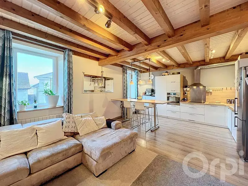 En exclusivité sur Collonges: Au cœur du village, joli duplex de type 5 de 106.35 m² utiles entièrement rénové en 2014 offrant hall avec placards, salon séjour avec cuisine équipée ouverte, une chambre, SDD WC.