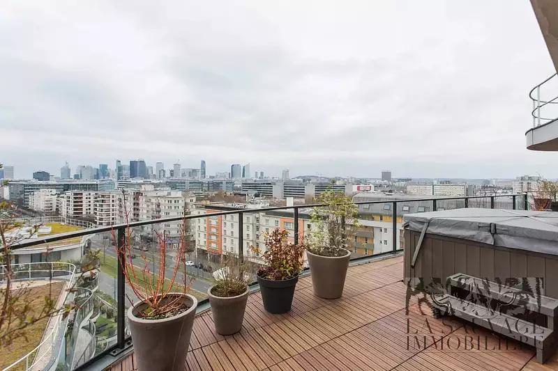 Magnifique vue panoramique. Situé au 10ème et dernier étage d'un immeuble récent construit fin 2019, cet appartement de 107m² loi Carrez avec une grande terrasse offrant une vue panoramique sur tous les monuments de Paris, de la Défense à la Tour Eiffel.