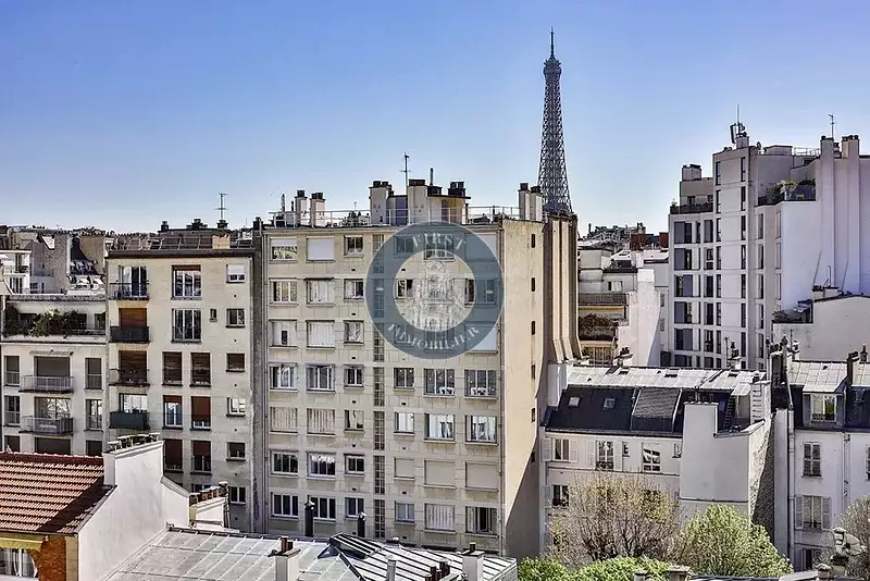Au sein d’un immeuble semi-récent de bon standing, cet appartement traversant de 108 m² offre de superbes volumes, une belle luminosité et une vue dégagée sur les toits de Paris et la Tour Eiffel.