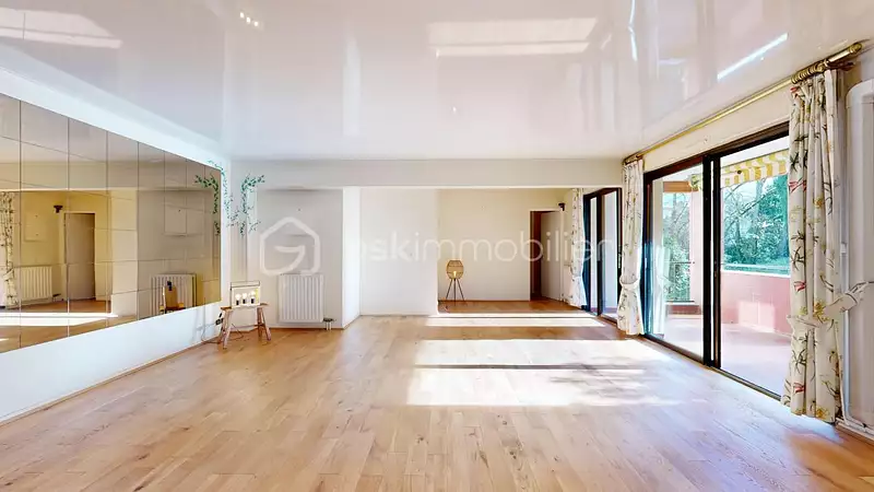 Le salon exposé sud-ouest bénéficie d'une belle luminosité et est équipé d'une climatisation réversible. L'ensemble s'ouvre sur un balcon de 8,2 m², et une loggia.