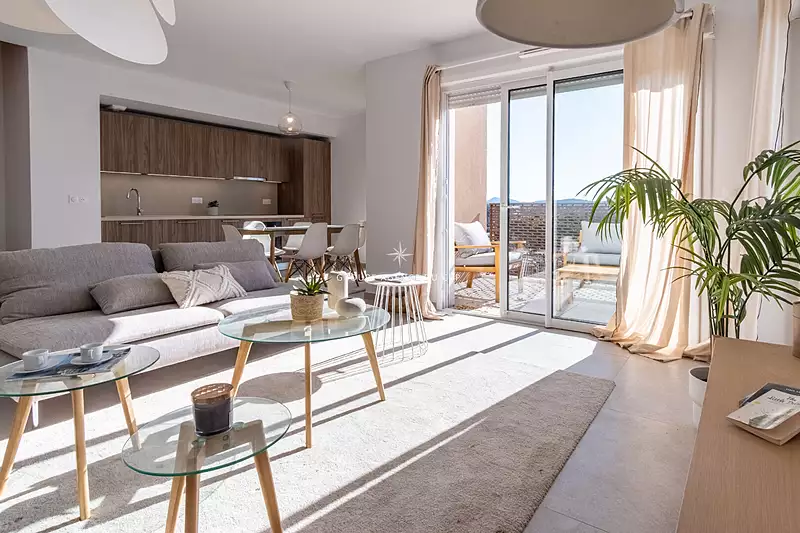 Appartement 4 pièces de 109,06 m², habitable immédiatement,. Séjour spacieux, balcon de 16,68 m² et superbe terrasse en roof-top de 91,83 m² avec vue mer et montagne. Terrasse renforcée pour installation d'un jacuzzi (support 2,20 m x 2,20 m) et pré-équipée pour une cuisine d'été. Volets roulants motorisés avec commandes centralisées. Carrelage 60x60 et faïence toute hauteur dans salle de bain et salle d'eau. Placards aménagés, chauffage et rafraîchissement par pompe à chaleur individuelle. Ouverture des accès roof-top électrique et manuelle. Prestations soignées et matériaux de qualité. Parking double en sous-sol avec accès direct par ascenseur inclus.