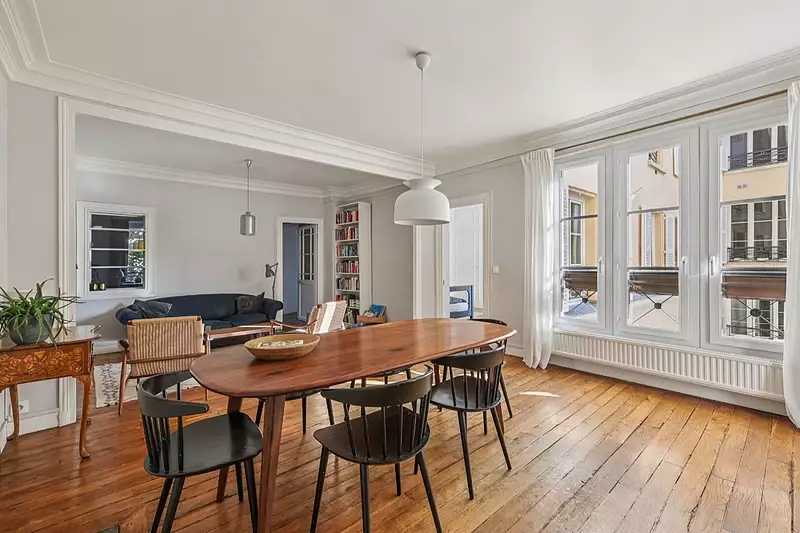Clair et calme, cet appartement de 110,6 m² situé au coeur du Haut-Marais allie charme, luminosité et sérénité dans l'un des quartiers les plus prisés du 3e arrondissement. Au 2e étage d'un immeuble typique du début du XIX? siècle (sans ascenseur), il offre de beaux volumes, environ 2,70m de hauteur de plafond et une triple exposition. Il se compose d'une entrée, d'un vaste séjour / salle à manger, d'une cuisine indépendante, de deux chambres, d'un grand bureau et d'une salle de bains avec WC. Grâce à sa double exposition sur une cour paisible et le boulevard arboré, l'appartement est doté d'une belle luminosité tout au long de la journée et d'un calme rare dans ce secteur. Idéal pour un couple, le télétravail ou une jeune famille, l'agencement fonctionnel offre un cadre de vie agréable à proximité immédiate des écoles, dont la réputée école bilingue Massillon, des cafés, restaurants et galeries du quartier. Adresse recherchée à deux pas de la rue de Bretagne, du concept store Merci, le marché gourmet Maison Plisson et de la place des Vosges. Métro ligne 8 à quelques minutes à pied. (4.00 % honoraires TTC à la charge de l'acquéreur.) Copropriété de 37 lots - dont 37 lots habitation. (Pas de procédure en cours). Charges annuelles : 3298.54 euros.