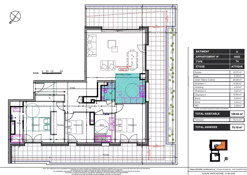 Sur la commune de Thonon-Les-Bains, dans une cité thermale où il fait bon vivre, entre le lac Léman et le massif du Chablais, appartement neuf 4 pièces de 109.93 m² au 4ème et dernier étage composé d'une entrée avec placard, d'un séjour/cuisine 40.09 m² donnant sur une immense terrasse qui fait en partie le tour de l'appartement de 75.10 m², d'une suite parentale avec dressing et salle d'eau, de deux chambres, d'une salle de bains et d'un wc séparé.