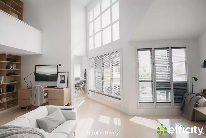 L'intérieur présente un plafond cathédrale de plus de 5 mètres de hauteur ouvert sur une baie vitrée avec balcon.