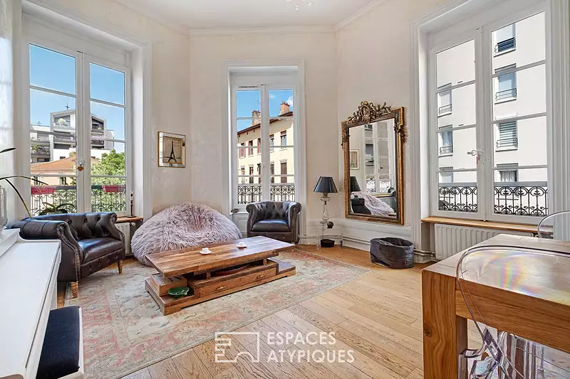 Situé à Lyon 9e, à deux pas de la passerelle Masaryk, cet appartement prend place au sein d'un immeuble du début du XXe siècle. Dès l'entrée, un large couloir dessert les différentes pièces de ce bien, où l'on trouve trois chambres de belles dimensions, dont une avec dressing, une salle d'eau moderne, un espace lecture, ainsi qu'un second espace faisant actuellement office de bureau. La pièce de vie, baignée de lumière grâce à ses nombreuses ouvertures et sa double orientation, se prolonge harmonieusement avec l'espace cuisine. L'appartement bénéficie également d'une cave voûtée de 52 m², ainsi que d'un cellier privatif situé sur le palier. A seulement 5 minutes de la gare de Vaise et du métro Valmy. Le charme de l'ancien, la hauteur sous plafond et la qualité de la rénovation sont les atouts majeurs de ce bien. Bien soumis au statut de la copropriété : 26 lots dont 26 lots d'habitation Charges annuelles : 1786.74 euros CLASSE ENERGIE : D / CLASSE CLIMAT : D Montant moyen estimé des dépenses annuelles d'énergie pour un usage standard, établi à partir des prix de l'énergie de l'année 2021 : entre 1270 et 1790 euros Contact : Ugo - 06 83 06 75 43 Copropriété de 26 lots - dont 26 lots habitation. (Pas de procédure en cours). Charges annuelles : 1786.74 euros. Celine KANNENGIESSER (EI) Agent Commercial - Numéro RSAC : 949 658 371 - LYON.
