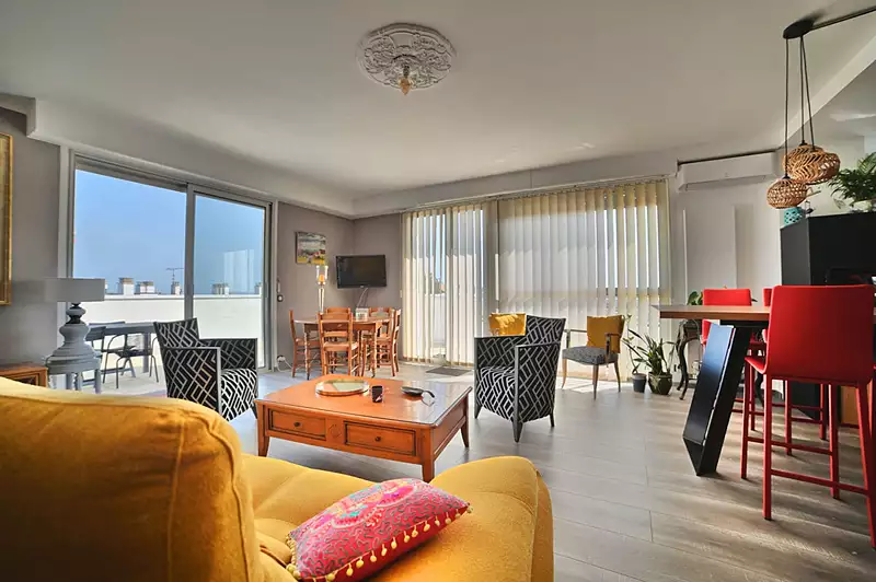 DERNIER ETAGE - PROCHE MARCHE CENTRAL - Vous serez alors séduit par ces 110m2, il est composé d'une magnifique cuisine ouverte donnant sur un salon-séjour lumineux de 32m², trois chambres au calme, cellier, une grande salle d'eau, un WC séparé. L'appartement est en très bon état général. Rien à faire juste poser vos valises. De plus vous serez conquis par sa belle terrasse de 75m² surplombant la ville de ROYAN, avec un aperçu mer. L'appartement se situe au dernier étage. L'ascenseur s'arrête au quatrième étage et vous aurez juste 17 marches pour accéder au dernier étage. Exposition Sud-Ouest au calme absolue. Une cave et un rare garage viennent compléter ce bien de qualité. (5.16 % honoraires TTC à la charge de l'acquéreur.) Copropriété de 237 lots - dont 134 lots habitation. (Pas de procédure en cours). Charges annuelles : 1685 euros.