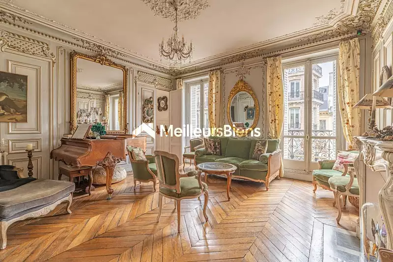 Il offre une réception lumineuse avec plus de 3 m de hauteur sous plafond, parquet point de Hongrie, moulures redorées, cheminées en marbre et un balcon filant de 5,8 m² avec vue dégagée. La salle à manger communique avec une cuisine équipée.