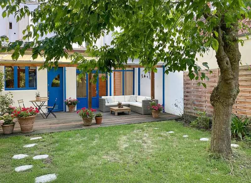 La pièce de vie, baignée de lumière naturelle, est pensée comme un lieu de partage. Sa cuisine semi-ouverte facilite les moments conviviaux. Depuis le séjour, la perspective est unique : un jardin arboré de 200 m², une terrasse intime à l'abri des regards… un véritable luxe citadin, à savourer été comme hiver.