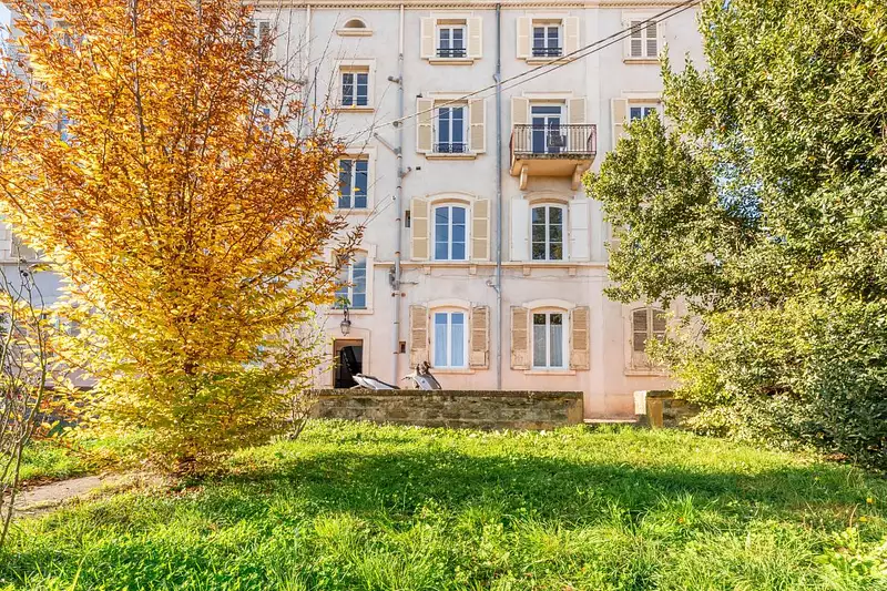 Immeuble de bon standing, escaliers en pierre, espaces verts..