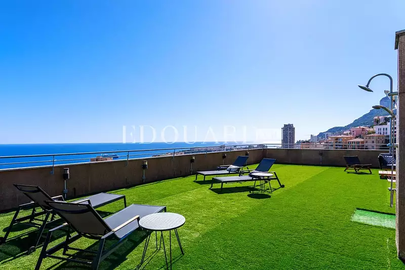 Cinq pièces à vendre sur la commune de Beausoleil, proches de tous les commerces : au dernier étage d'un immeuble contemporain surplombant la Principauté de Monaco, splendide penthouse de 116 m² complètement rénové avec magnifique vue mer panoramique, porte blindée, climatisation réversible, double vitrage, deux caves et deux parkings. Composé d'entrée, double séjour très lumineux, cuisine indépendante équipée, chambre en suite, 2 chambres à coucher, bureau, dressing, salle de bains avec fenêtre, 24 m² de balcon, 254 m² de spectaculaire toit terrasse. Idéalement exposé Sud, ensoleillé et au calme, pratique pour l’autoroute et l’aéroport de Nice. Vendu meublé, produit excellent.