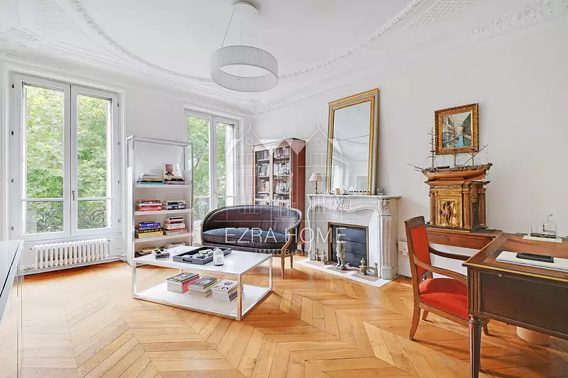 Situé au 3e étage d’un bel immeuble haussmannien, Ezra Home vous présente un appartement de 117 m2, empreint du charme parisien, avec son parquet en pointe de Hongrie, ses moulures raffinées et sa belle hauteur sous plafond de plus de 3 mètres.