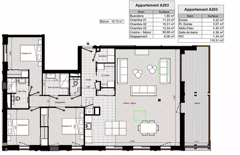 | 119 m² - 4 pièces - 3 chambres - ter. 19 m² | Cave |
