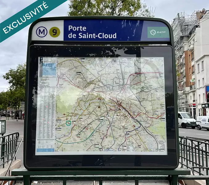 À proximité de la Porte de Saint-Cloud, des commerces, des restaurants, des transports (ligne 9 et bus) et des écoles.