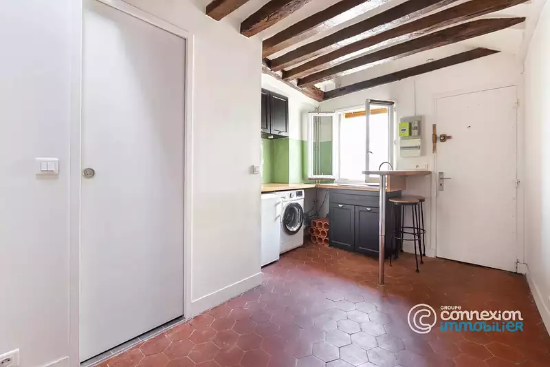 Confortable studio au 5ème étage d'un petit immeuble de la rue de Bretagne composé d'une pièce de vie avec un cuisine ouverte, une salle d'eau avec wc. l'espace nuit se trouve en mezzanine, éclairé par un velux. Beaucoup de charme et emplacement n°1 à côté du Marché des Enfants Rouges.