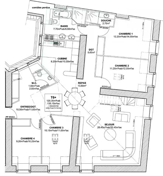 | 120 m² - 6 pièces - 4 chambres | Dernier étage (5ème) |