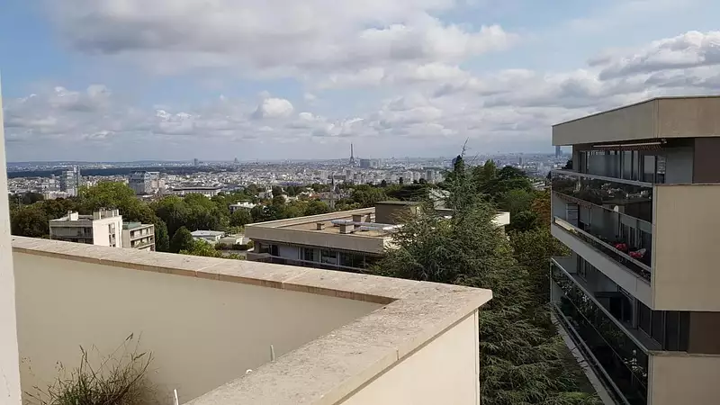 Haut de Bellevue, appartement au 7ème et dernier étage, vue imprenable sur Paris et forêt. 4 chambres et très grand séjour actuellement divisé 2 tiers 1 tiers, deux salles de douche ou bain, deux wc, dressing et placards, cuisine (à garnir librement), terrasse de 26m² . Votre imagination fera le reste selon les nombreuses possibilités d'aménagement. Très bonne isolation thermique et phonique, diagnostic environnemental exceptionnel dans le quartier (perf.énergétique D - Gaz effet serre D). Grande cave, parking aérien au pied de l'immeuble. Parties communes parfait état et sécurisées avec gardien permanent - garage à vélos. Parc arboré de six immeubles bien espacés. Montparnasse à 25 min de porte à porte. Proximité des commodités pour scolarité et courses. Coûts : Sols-murs à rafraîchir + un peu d'électricité, d'où prix abaissé à 685.000 euros frais compris sauf notaire. Charges env. 500 par mois dont chauffage eau chaude - pas de gros travaux votés - taxe foncière 2700 euros/an.