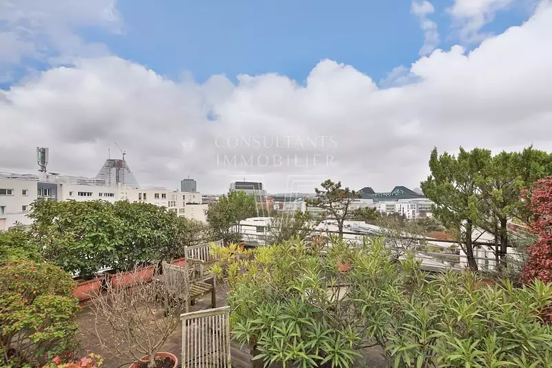 Appartement familial en duplex, baigné de lumière et au calme absolu, bénéficiant d'une grande terrasse de 58 m² et d'un large balcon.
