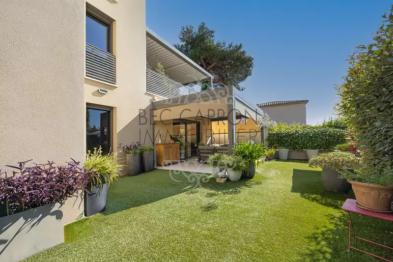 En plein cœur du village de Puyricard, au calme, superbe appartement en rez-de-jardin situé dans une résidence récente et confidentielle de grand standing, composée de seulement 12 logements.