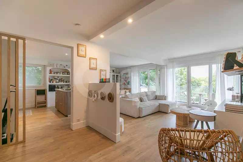 • Double séjour lumineux avec accès direct sur un grand balcon terrasse de 18 m², exposé Ouest face à la Marne, et cuisine ouverte entièrement équipée