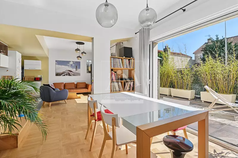 L'agence Immobilière des Musiciens vous propose aujourd'hui en exclusivité, ce spacieux duplex de plus de 124 m2, entièrement repensé et rénové par une architecte en 2017. Cet appartement allie modernité, luminosité et fonctionnalité, le tout dans un cadre calme, agréable, à 10 mn du RER Nanterre Ville et des commerces du Centre-Ville. Au rez-de-chaussée vous trouverez un espace de vie (38 m2) extrêmement lumineux donnant sur la terrasse de 45 m2, avec sa cuisine qui restera équipée, la partie séjour salle à manger bien distincts, une chambre qui est aujourd'hui un bureau, idéal pour le télétravail ou pour recevoir, des toilettes et l'accès à l'étage. Au niveau du rez de chaussée également une cave bien pratique et surtout très saine. À l'étage, trois chambres, dont une suite parentale disposant de sa propre salle de douche, d’un espace dressing et buanderie pour un confort optimal au quotidien, un plateau salle de jeux de plus de 12 m2 que nous pouvons facilement transformée en cinquième chambre selon votre projet de vie. Avec ses deux pièces d’eau, ses volumes généreux et sa belle distribution, ce bien est parfaitement adapté à la vie de famille. L’intérieur, baigné de lumière, est particulièrement bien entretenu. Nous insistons qu'il n'est pas facile de trouver, même des maisons avec quatre, voire cinq chambres. Et pour que cet appartement à l'esprit maison soit parfait, cerise sur le gâteau : une grande terrasse de 45 m2, exposée sud ouest, de plein pieds depuis la pièce de vie, idéale pour les repas et les moments de détente ensoleillés. Attention : à mon avis cela sera souvent votre tour d'organiser les évènements chez vous ! Sinon coupez la sonnette. Ce duplex unique sera le coup de cœur pour une famille, en quête d’espace, de confort et de prestations de qualité. C'est le moment de se poser dans un lieu qui vous correspond vraiment.