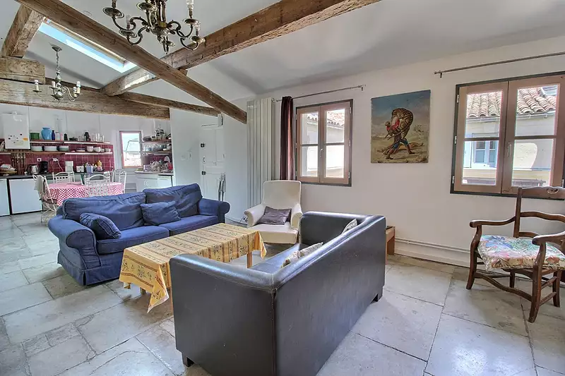 Cet appartement mansardé et baigné de lumière avec ses 4 expositions offre 125 m² habitables et déploie un cachet exceptionnel : poutres apparentes, pierres d'époque, volumes atypiques et ambiance chaleureuse.