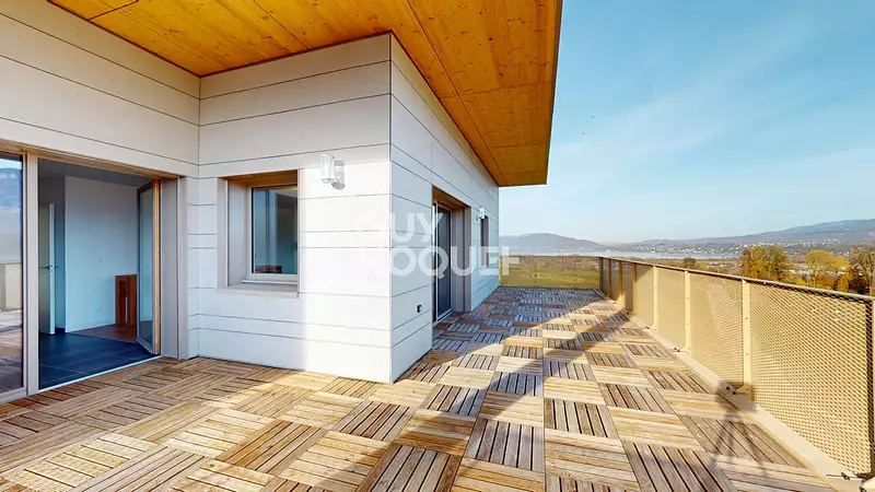 Situé sur la commune de La Motte Servolex mais à 4 minutes du centre du Bourget du lac ainsi que de Technolac, ce très bel appartement de type 5 se trouve au dernier étage d'une résidence récente et recherchée. Rare à la vente, ses deux terrasses totalisant 74 m² offrent des vues magnifique sur le lac du Bourget et les montagnes environnantes. Dès l'entrée, vous serez séduit par sa luminosité, ses volumes généreux et son atmosphère chaleureuse. La pièce de vie s'ouvre sur une immense terrasse, idéale pour profiter du soleil et du panorama. La cuisine, moderne et entièrement équipée, allie confort et convivialité. Côté nuit, une suite parentale avec dressing ainsi que trois chambres, toutes donnant sur une seconde terrasse avec vue lac. L'appartement est vendu entièrement meublé, avec des finitions soignées et une décoration pensée dans les moindres détails. L'appartement dispose également de deux salles d'eau, d'une salle de bain et de deux WC, offrant un confort optimal pour la vie quotidienne. En annexe, un garage en sous-sol vient compléter ce bien, avec la possibilité d'acquérir un second garage en sus, adapté aux normes PMR. Un bien rare sur le secteur, alliant élégance, confort et cadre de vie privilégié. Un véritable coup de coeur pour celles et ceux en quête d'un appartement moderne, lumineux et au calme, à 300 m de Technolac, à quelques minutes du centre du Bourget-du-Lac et à 10 minutes de Chambéry ou d'Aix-les-Bains. Copropriété de 234 lots - dont 77 lots habitation. (Pas de procédure en cours). Charges annuelles : 2816.76 euros.