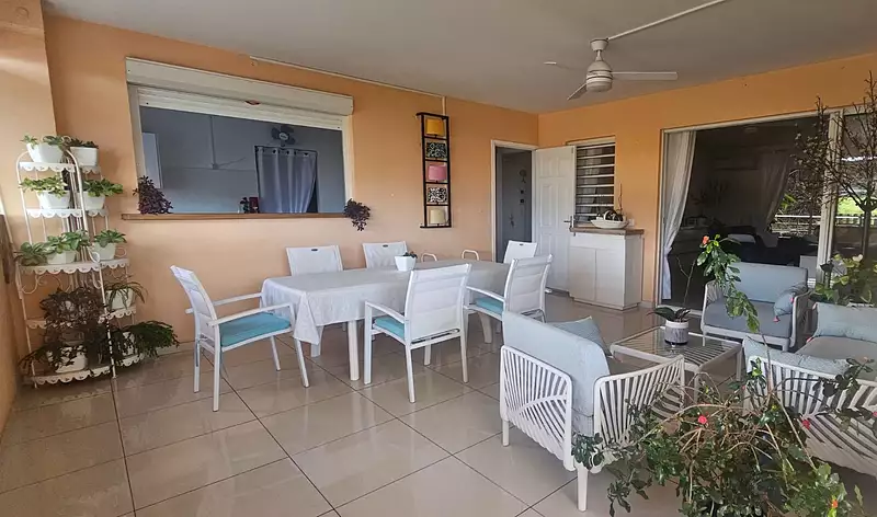 Une cuisine aménagée moderne et ouverte sur une très grande terrasse, idéale pour vos moments de détente ou de réception.