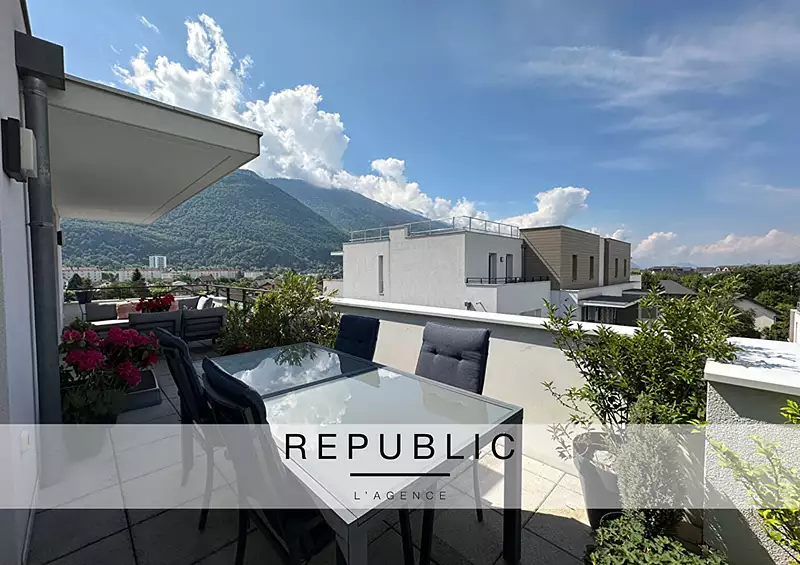 VOTRE AGENCE REPUBLIC vous propose en EXCLUSIVITE ! Rare à la vente, un appartement T5 d'env. 127m² en dernier étage avec terrasse d'env. 30m², composé d'une entrée avec placard, vaste pièce de vie donnant sur la terrasse exposée plein sud, cuisine ouverte entièrement équipée, 4 chambres, 2 salles d'eau, 2 WC. 1 grand garage de 24m² accès PMR vient compléter ce bien. Copropriété de 2019 CHAUFFAGE ET EAU CHAUDE COMPRIS DANS LES CHARGES La présente annonce a été rédigée sous la responsabilité éditoriale de Madame Aurélie KNIEBIHLY, négociatrice immobilier indépendante (sans détention de fonds) immatriculée au RSAC de CHAMBERY (Savoie) sous le numéro 751 383 001, pour le compte de la société dénommée SARL REPUBLIC. Les informations sur les risques auxquels ce bien est exposé sont disponibles sur le site Géorisques: www.georisques.gouv.fr Copropriété de 138 lots - dont 64 lots habitation. (Pas de procédure en cours). Charges annuelles : 2600 euros. Aurélie KNIEBIHLY (EI) Agent Commercial - Numéro RSAC : 751383001 - CHAMBERY.