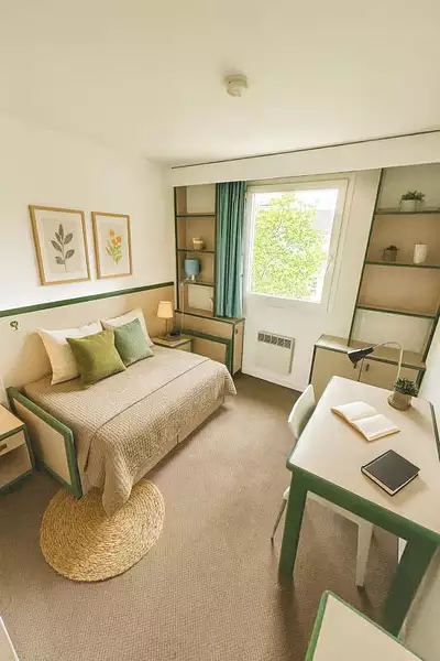 Chambre très fonctionnelle de 12 m², située au quatrième étage d'une résidence de service dans un quartier très dynamique et bien desservi par les transports en commun (tramway).Une kitchenette et un bureau ainsi que les placards aménagés composent cette chambre qui bénéficie du wi-fi gratuit. Salle d'eau et toilettes sont communs à un bloc de six chambres par étage. On retrouve également en sous-sol une buanderie équipée de laves-linges et de sèches-linges.La résidence est équipée de caméras, et sécurisées par la présence quotidienne d'un gardien.