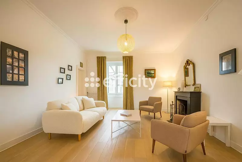 Au premier étage d'un immeuble de trois niveaux, ce bien comprend un vaste séjour de 26 m², une salle à manger de 15 m² ou 4ème chambre, trois chambres spacieuses, une cuisine équipée, ainsi qu'une cave pour du stockage supplémentaire.