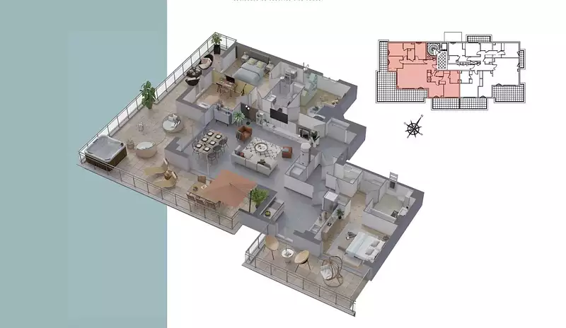 5 pièces neuf de 133,99 m2 avec deux terrasses, une de 62,20m2 et l'autre de 14,90m2 de 26 m2, expo Est - Sud Ouest.