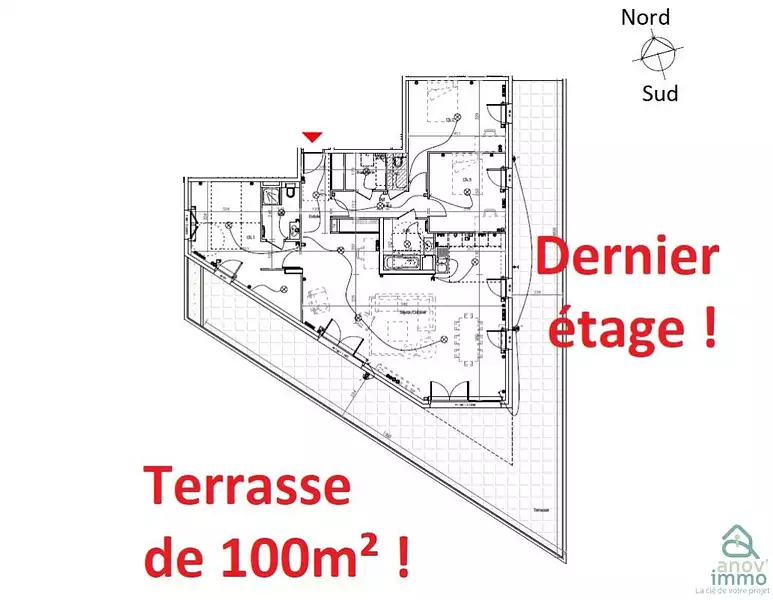 Appartement composé d'un grand séjour/cuisine de presque 60m2 exposé plein sud, de trois grandes chambres dont une suite parentale (23m2, 16m2 et 13m2) et d'une grande terrasse.