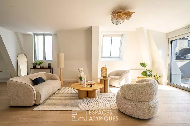 Au coeur de Lorient, dans un bâtiment historique d'exception, cet appartement T4 en duplex de 129 m² se situe au coeur d'une résidence de standing. Son emplacement, à deux pas des commerces et des commodités, offre une vie citadine agréable tout en bénéficiant du calme et de la sécurité d'une résidence de prestige. Avec une belle terrasse exposée plein sud, cet appartement saura séduire les amateurs de biens uniques et raffinés. Dès l'entrée, l'appartement dévoile une vaste pièce à vivre lumineuse, un espace cuisine ouverte à aménager, ainsi qu'une chambre avec dressing et un WC séparé. A l'étage, deux chambres spacieuses, une salle d'eau moderne et un WC viennent compléter les lieux. La disposition de l'espace permet de séparer parfaitement les zones de vie et de nuit, pour un confort optimal. La terrasse extérieure, véritable atout de cet appartement, invite à la détente et aux moments conviviaux en plein coeur de la ville. Enfin, l'appartement dispose d'une grande cave en sous-sol , d'une place de stationnement sécurisée pour une voiture et une moto L'environnement immédiat, avec ses commerces, ses écoles et ses transports, rend cet appartement particulièrement prisé pour une vie urbaine dynamique et agréable. L'architecture historique du bâtiment et les prestations de la résidence viennent renforcer le caractère atypique et raffiné de ce bien. Lorient, ville portuaire à l'histoire riche, séduit par son dynamisme, ses événements culturels et son accès privilégié aux plages bretonnes, faisant de cet appartement un bien idéal pour une vie citadine alliant confort et sérénité. Cet appartement est une opportunité rare sur le marché immobilier lorientais. Découvrez d'autres opportunités au sein de cette réhabilitation emblématique, offrant des espaces de vie d'exception. CLASSE ENERGIE : C / CLASSE CLIMAT : A Montant moyen estimé des dépenses annuelles d'énergie pour un usage standard établi à partir des prix de l'énergie des années 2021, 2022, 2023 : entre 1430 euros et 1970 euros/an Les informations sur les risques auxquels ce bien est exposé sont disponibles sur le site géorisques : www.georisques.gouv.fr Simon JOUANNO 06 31 35 17 70 RSAC Lorient 929 999 316 Copropriété de 72 lots (Pas de procédure en cours). Charges annuelles : 2830 euros. Simon JOUANNO (EI) Agent Commercial - Numéro RSAC : 929999316 - LORIENT.