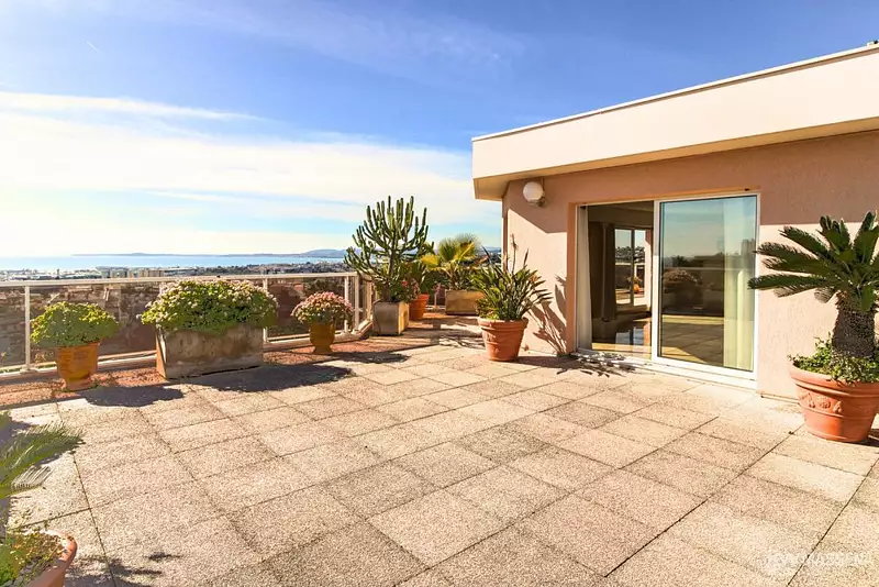 Nous avons le plaisir de vous présenter une exceptionnelle villa sur le toit de 134m2, située dans le quartier de la Corniche Fleurie, proche écoles, bus et commerces de quartier. L'appartement, en dernier étage d'un immeuble de 5 étages nouvellement ravalé, seul sur le palier, bénéficie d'une somptueuse terrasse de 134m2 bénéficiant de 3 expositions, offrant une vue imprenable sur la mer et les collines. La résidence est sécurisée, avec une très belle piscine, espaces verts, jardin d'enfants et table de ping-pong. L'appartement bénéficie d'un vaste séjour d'angle de plus de 43m2 ouvert sur l'extérieur. Une cuisine aménagée et équipée, 2 belles chambres avec chacune sa salle d'eau/bain et une chambre parentale de 19m2 avec salle de bains/WC et dressing. Un WC indépendant. L'appartement est entièrement équipé de la climatisation réversible, au calme et très lumineux. Un garage en sous-sol complète ce bien rare, possibilité d'acquérir un second garage en sus.